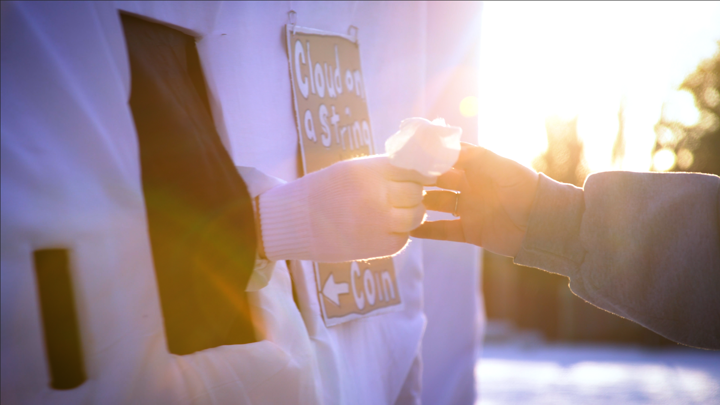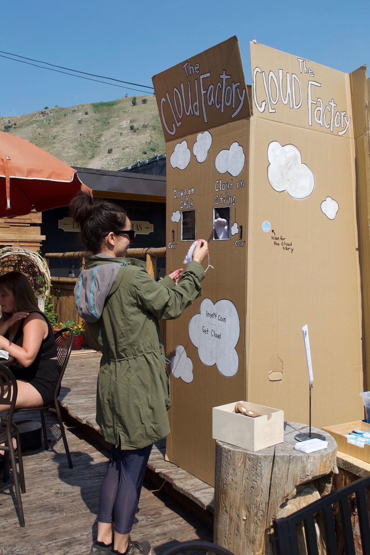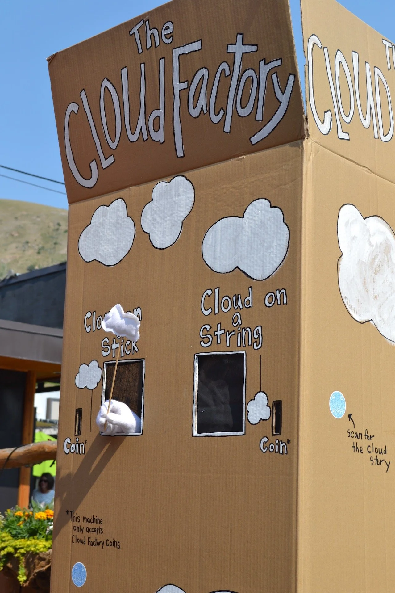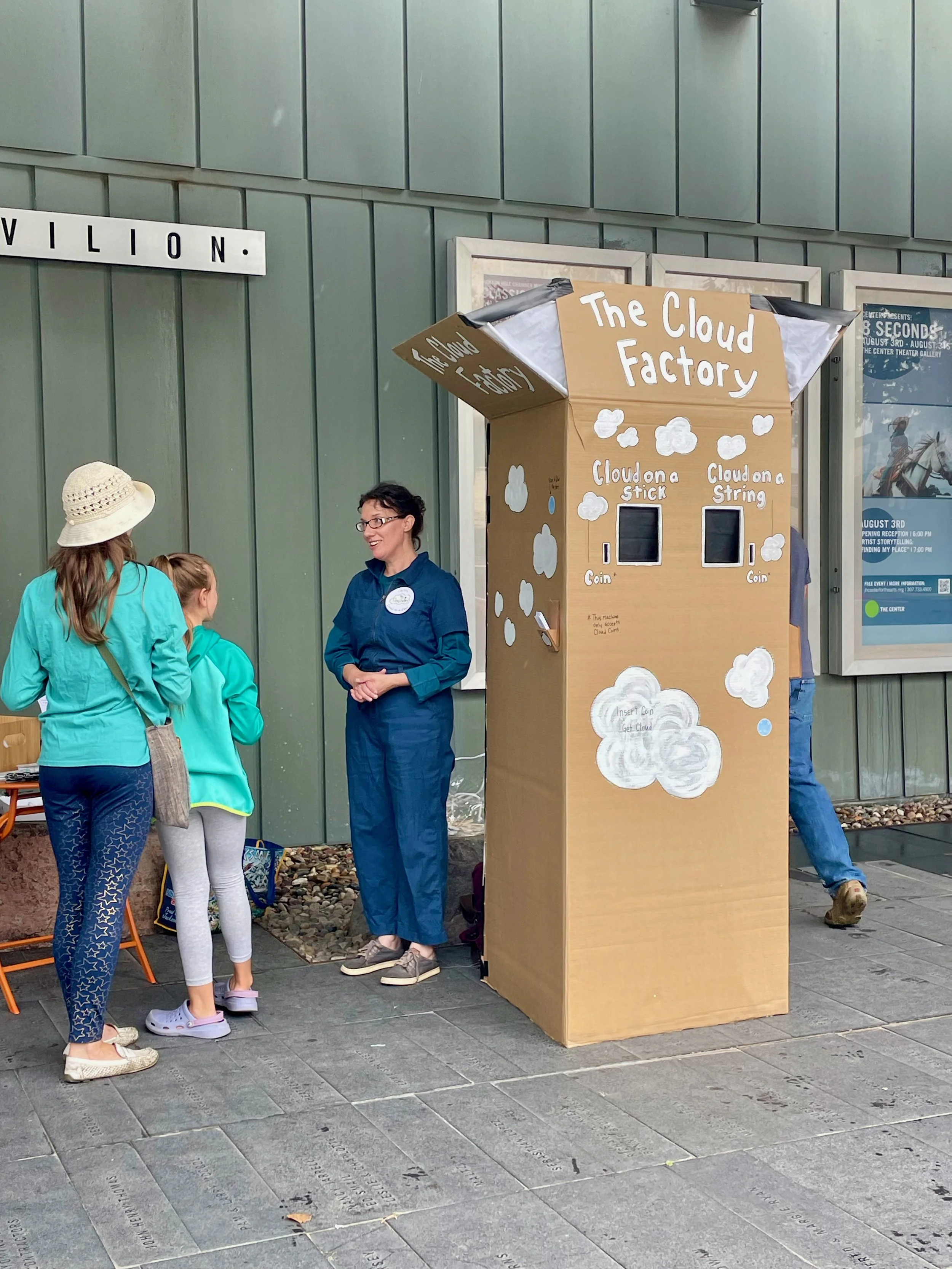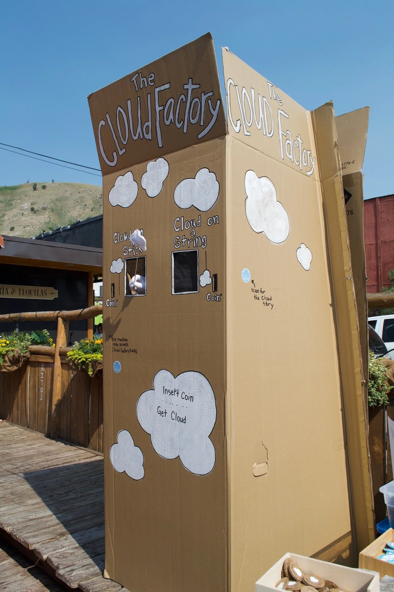 For one day in early March of 2020 the Pavilion on the lawn of the Center for the Arts in Jackson, WY became a Cloud Factory. Cloud Engineers were trained to run the Factory, and coins were distributed. Cloud music was played, Cloud merch was sold, Cloud drinks were consumed. During this time, Cloud Conductor Skyy (aka Jenny Dowd) opened the factory and dispensed hundreds of clouds to a wondering audience. And then, like a cloud, it was gone.