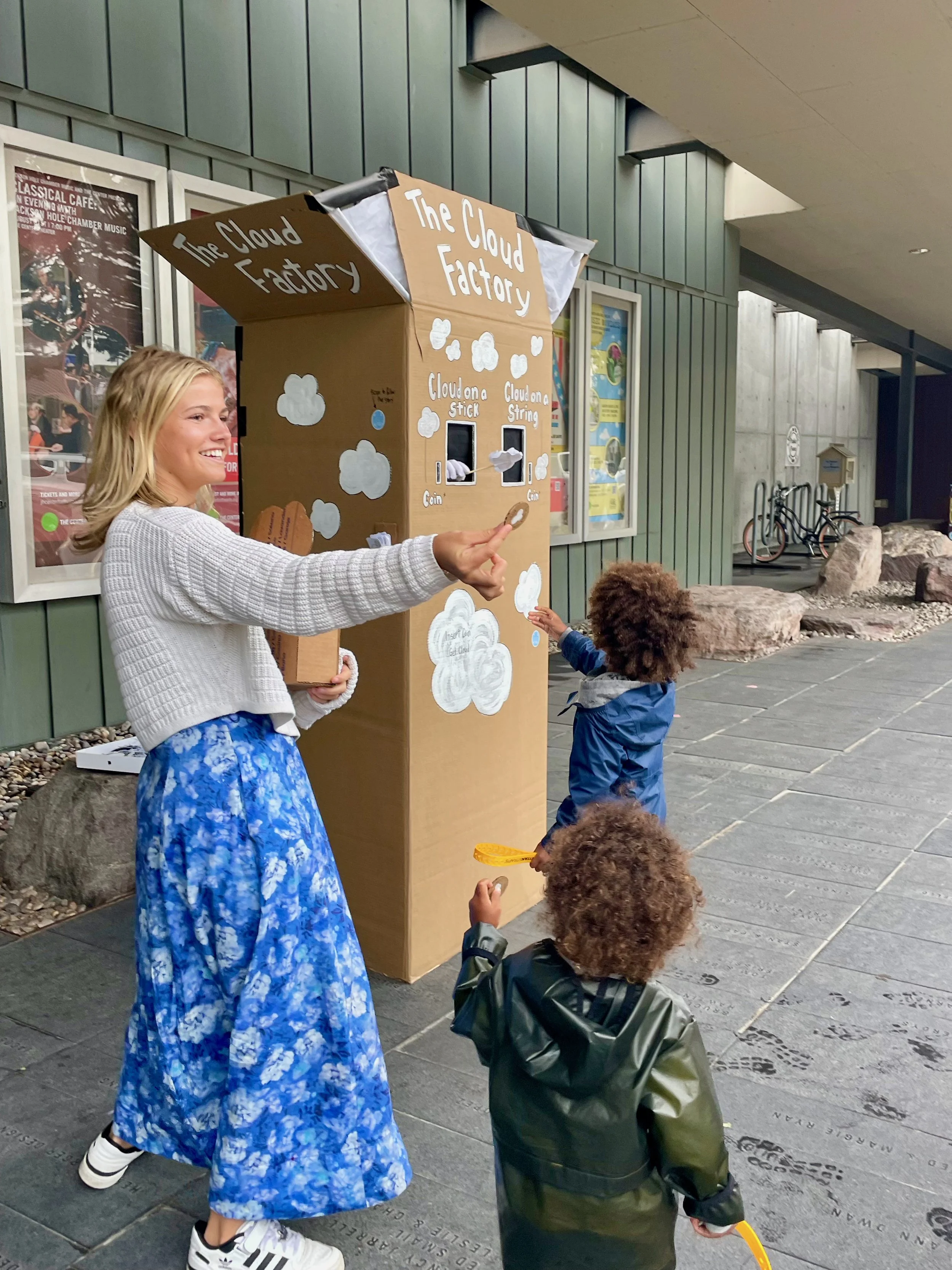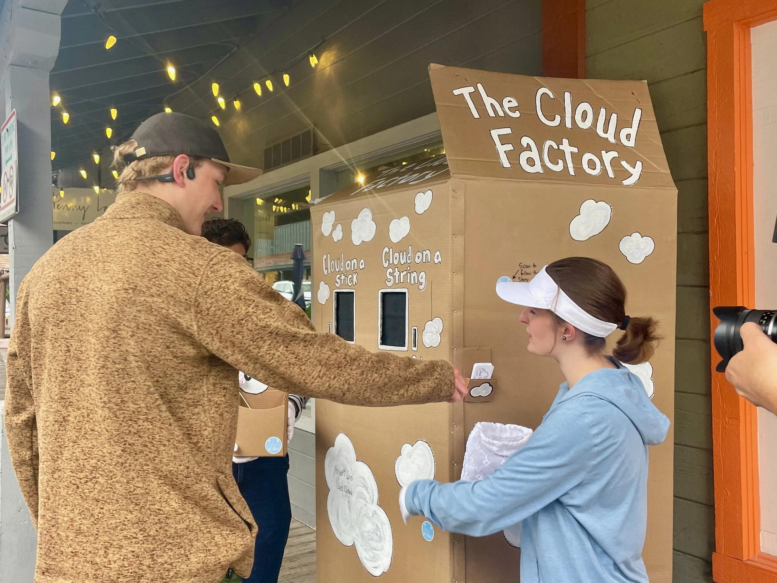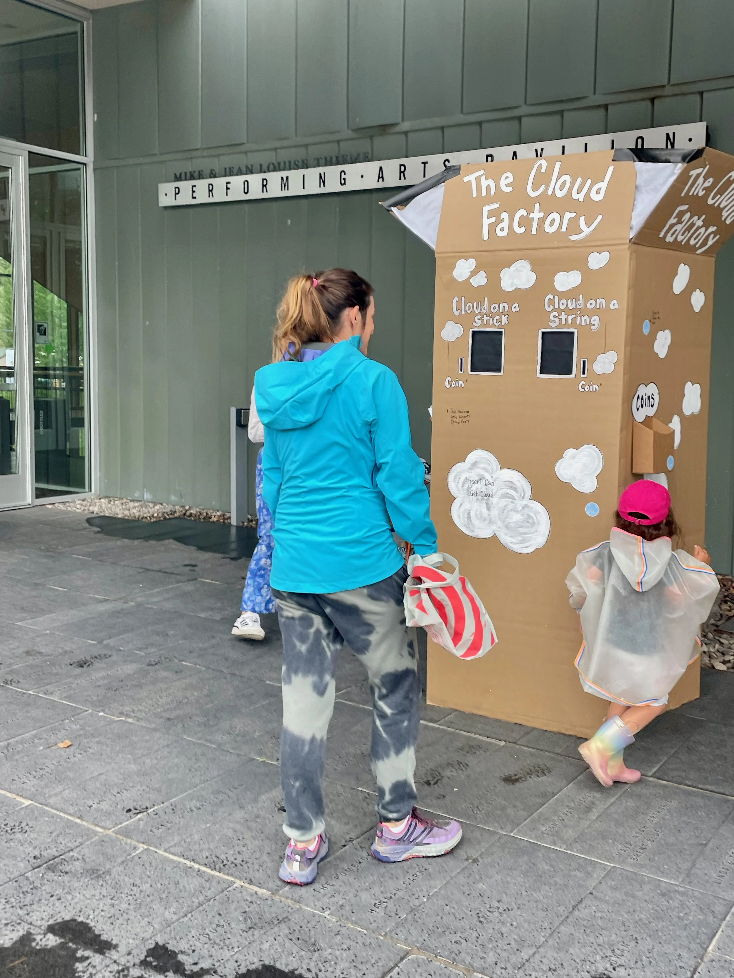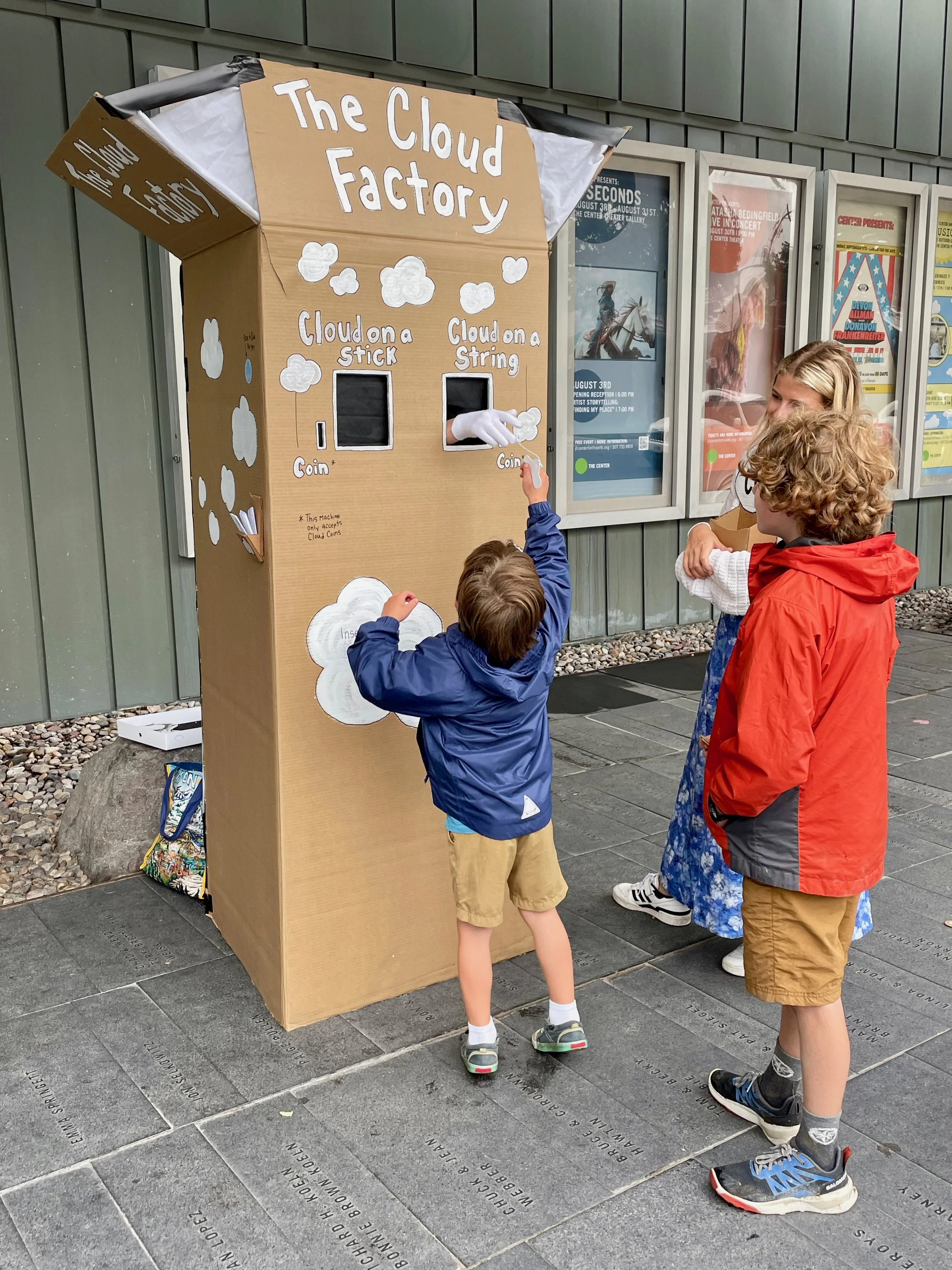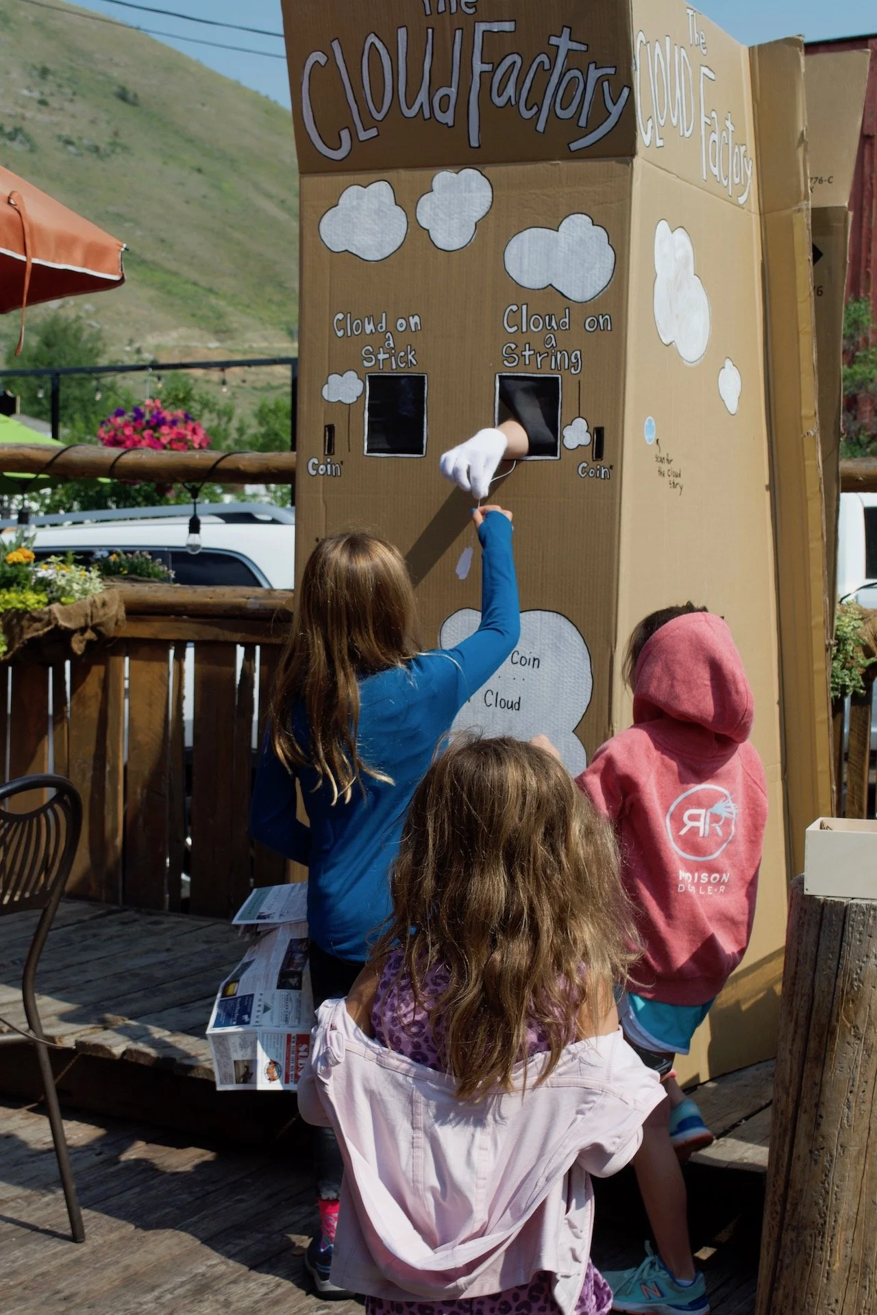 For one day in early March of 2020 the Pavilion on the lawn of the Center for the Arts in Jackson, WY became a Cloud Factory. Cloud Engineers were trained to run the Factory, and coins were distributed. Cloud music was played, Cloud merch was sold, Cloud drinks were consumed. During this time, Cloud Conductor Skyy (aka Jenny Dowd) opened the factory and dispensed hundreds of clouds to a wondering audience. And then, like a cloud, it was gone.