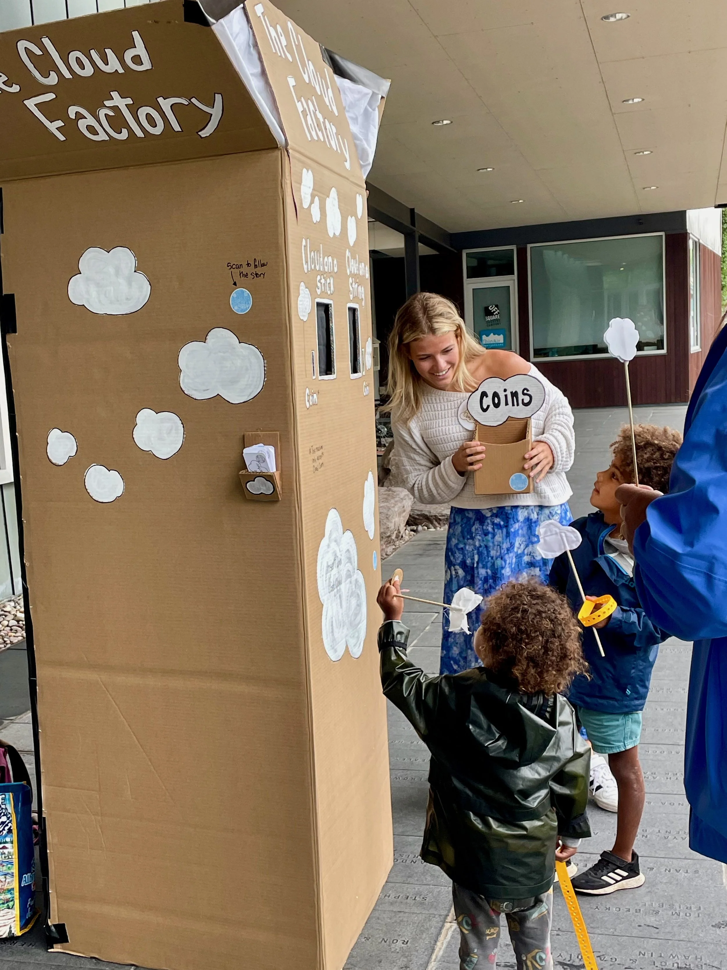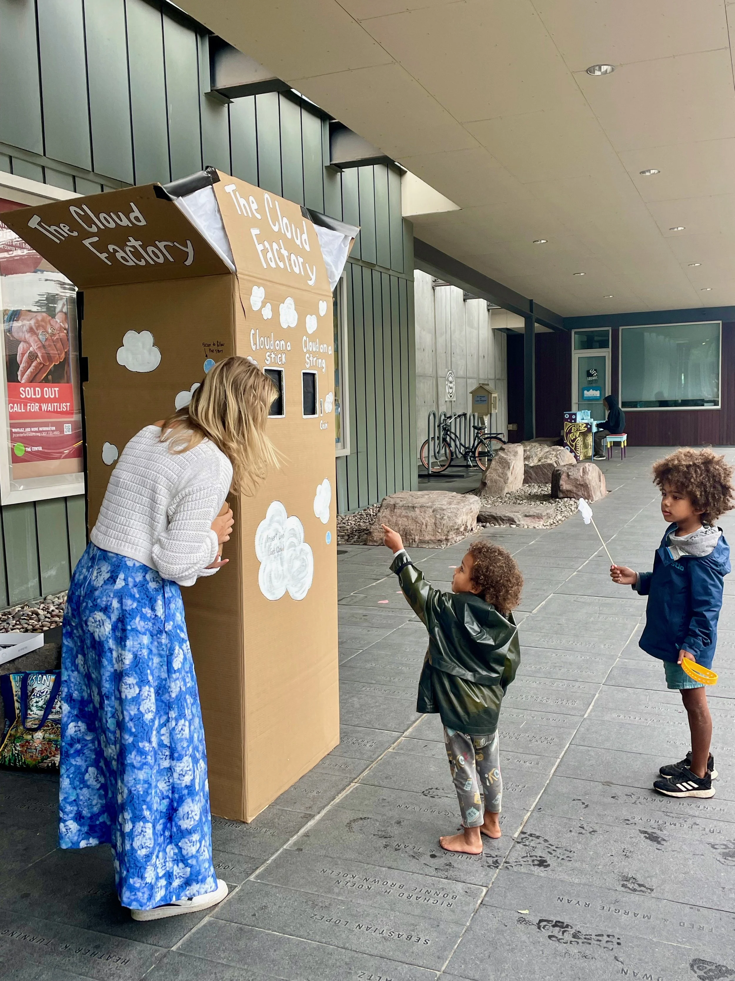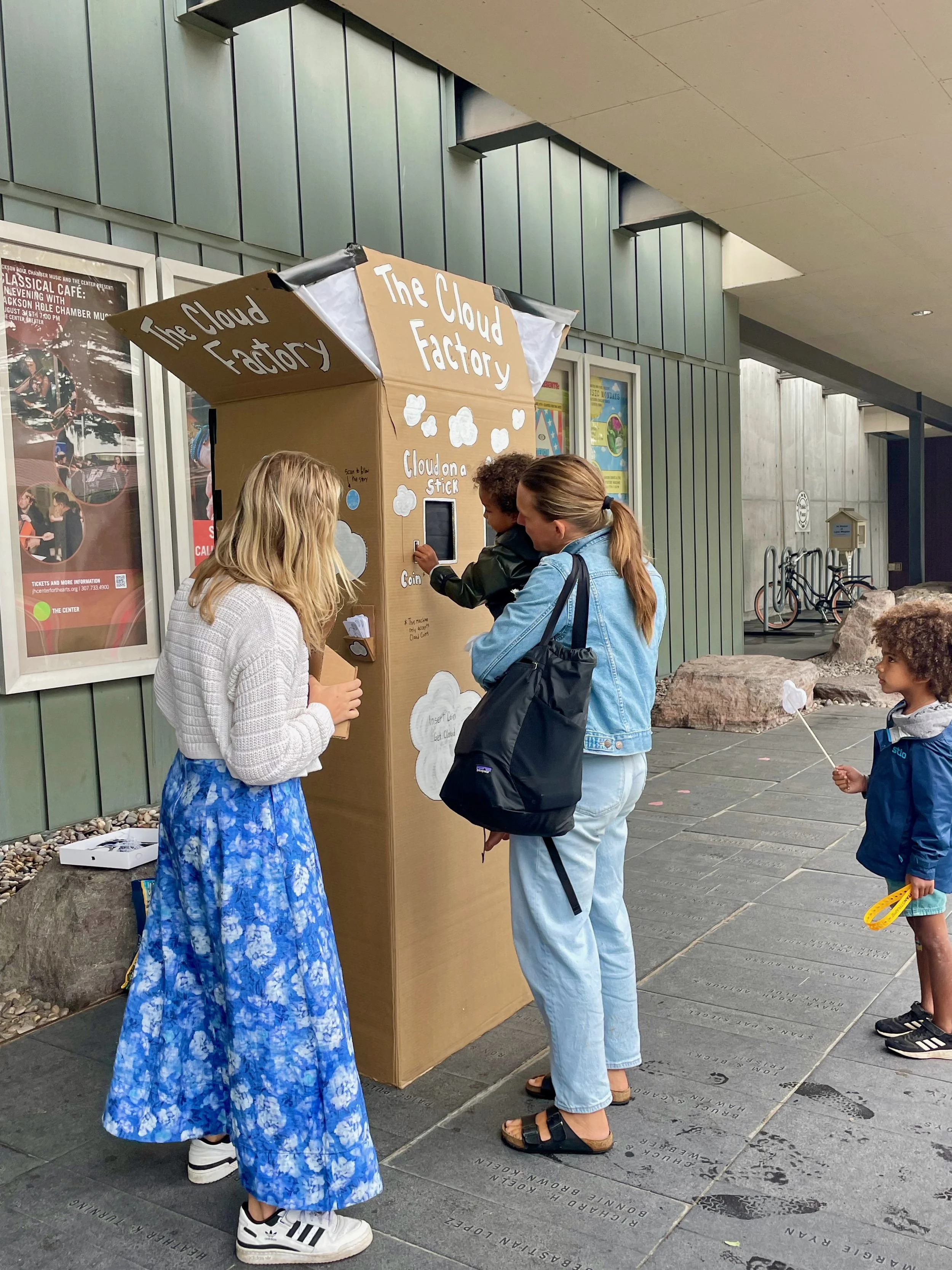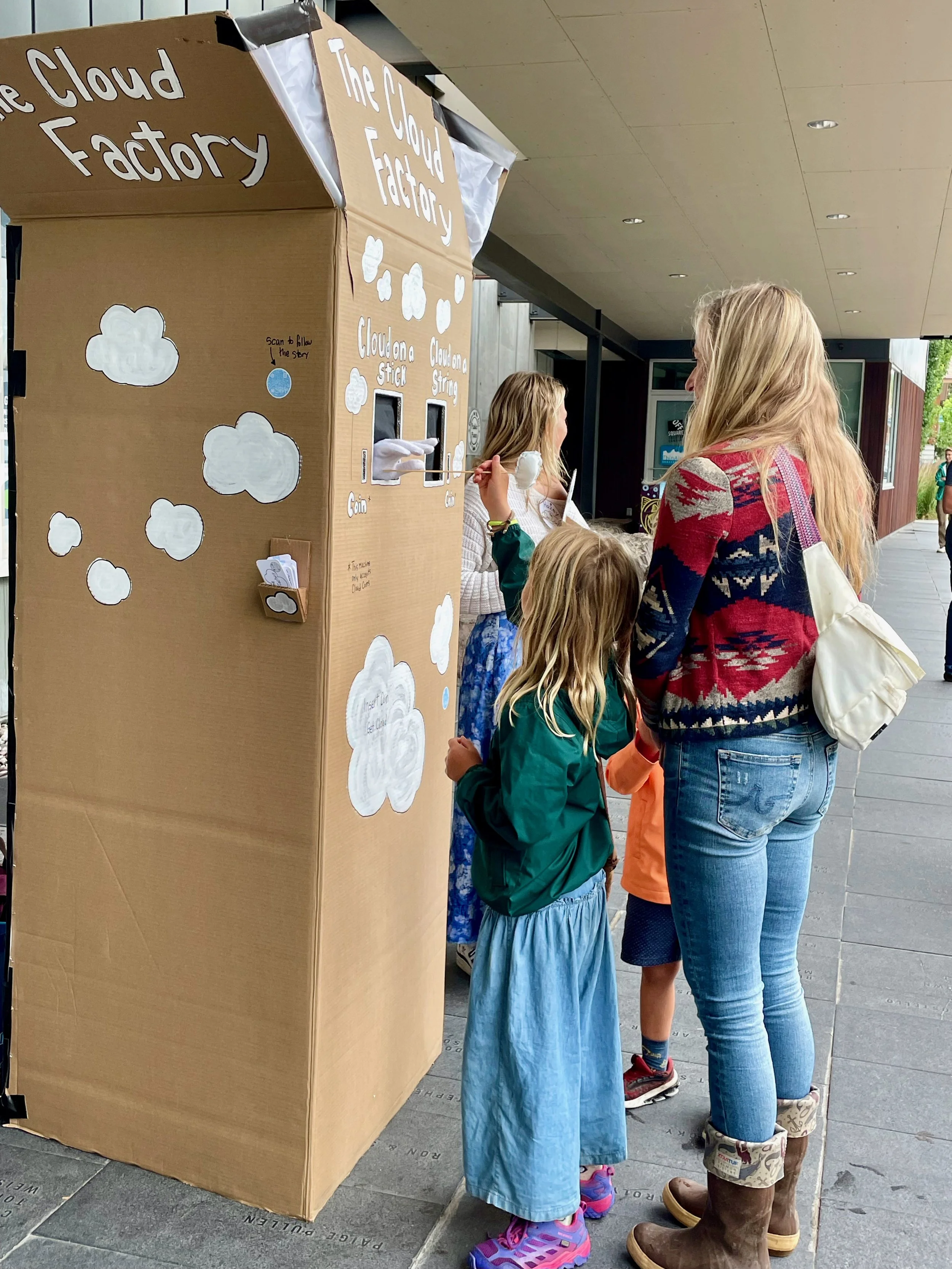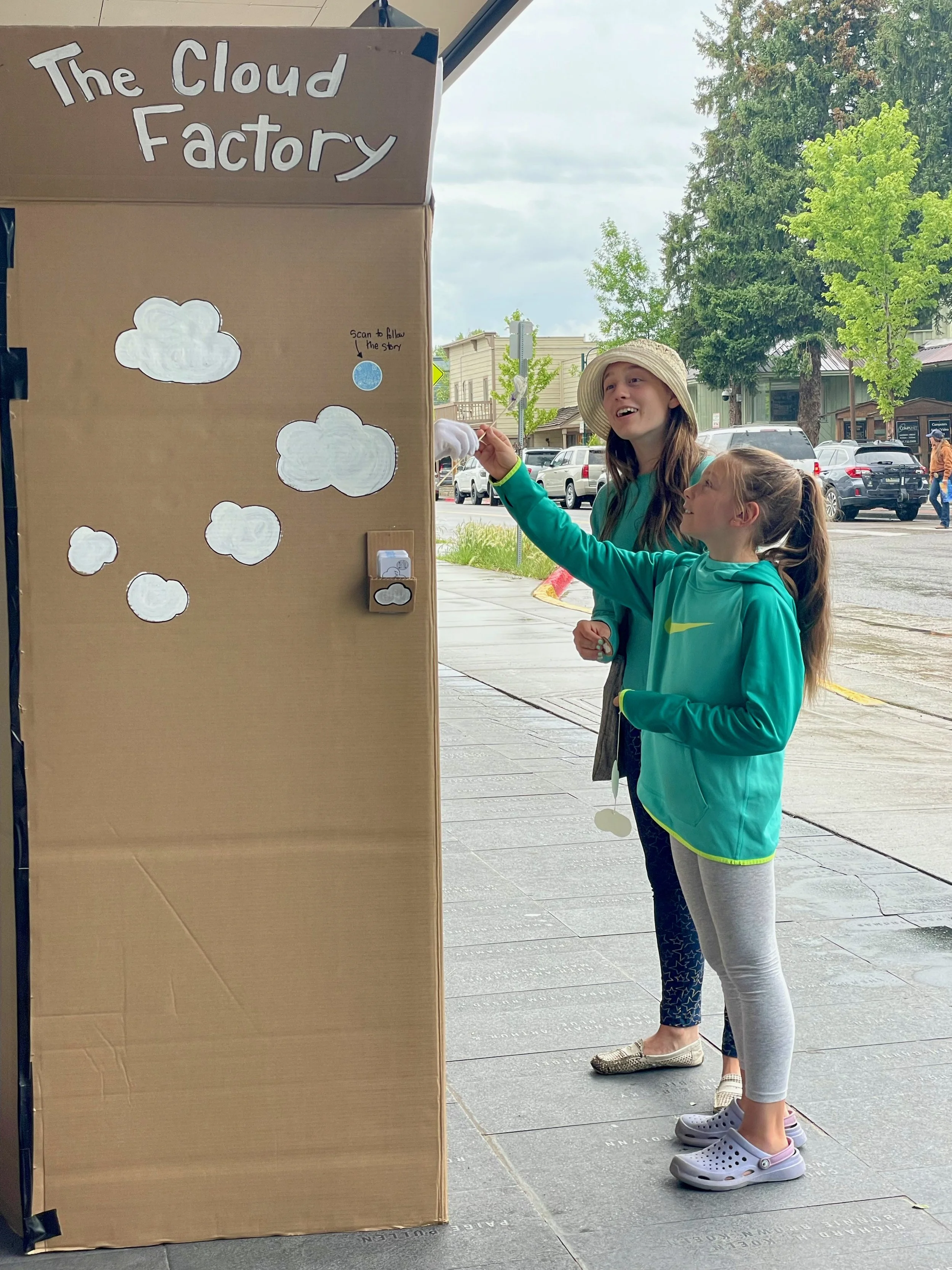 For one day in early March of 2020 the Pavilion on the lawn of the Center for the Arts in Jackson, WY became a Cloud Factory. Cloud Engineers were trained to run the Factory, and coins were distributed. Cloud music was played, Cloud merch was sold, Cloud drinks were consumed. During this time, Cloud Conductor Skyy (aka Jenny Dowd) opened the factory and dispensed hundreds of clouds to a wondering audience. And then, like a cloud, it was gone.