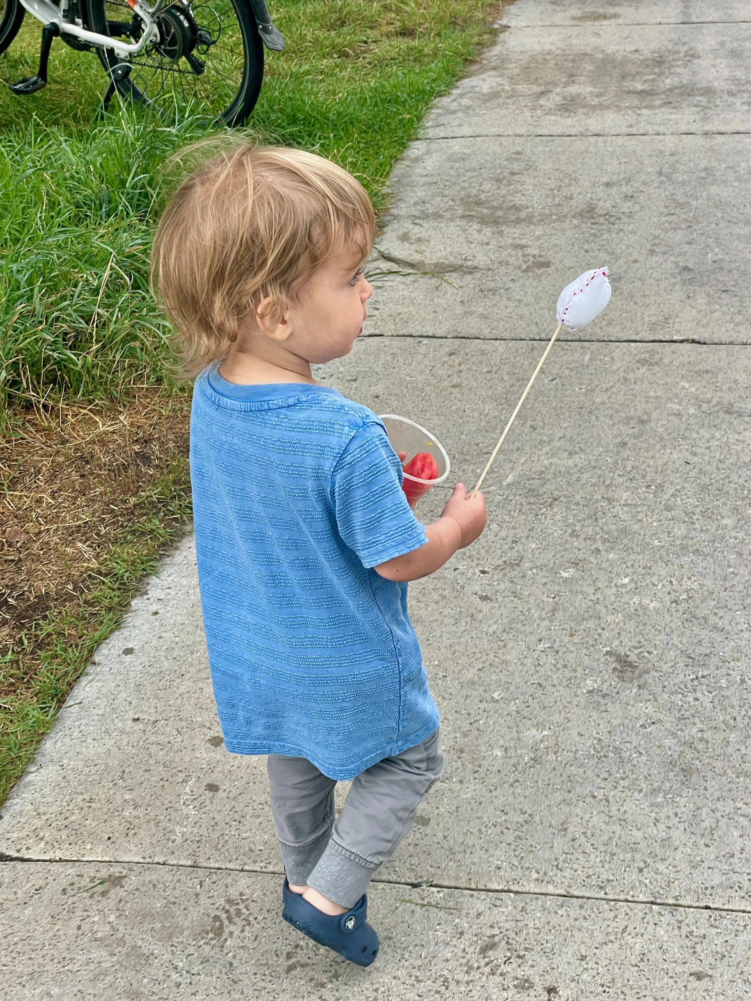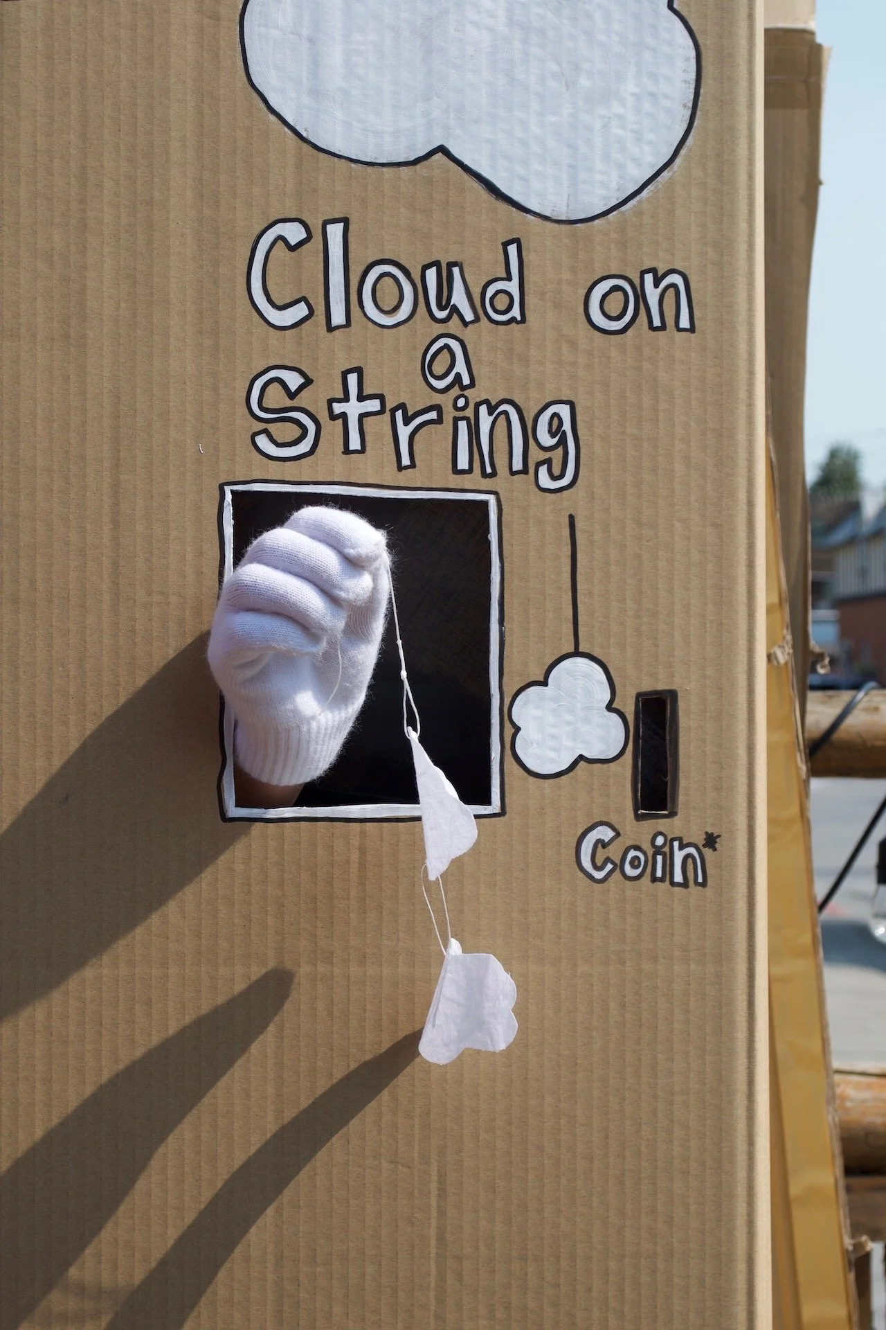 In the summer of 2021 the Cloud Factory returned to the boardwalk of Jackson, this time as a portable dispensing unit. Jenny became the new Cloud Conductor as Jenny-Dowd-on-a-Cloud. 2021 coins were minted. Cloud Kits were distributed and collected. The portable dispensing unit was fabricated. With the help of a fearless friend, coins were distributed to a curious and skeptical audience who chose either a cloud on a stick or cloud on a string. They inserted the coin, cloud factory noises were produced, and gloved hand emerged with the requested cloud.